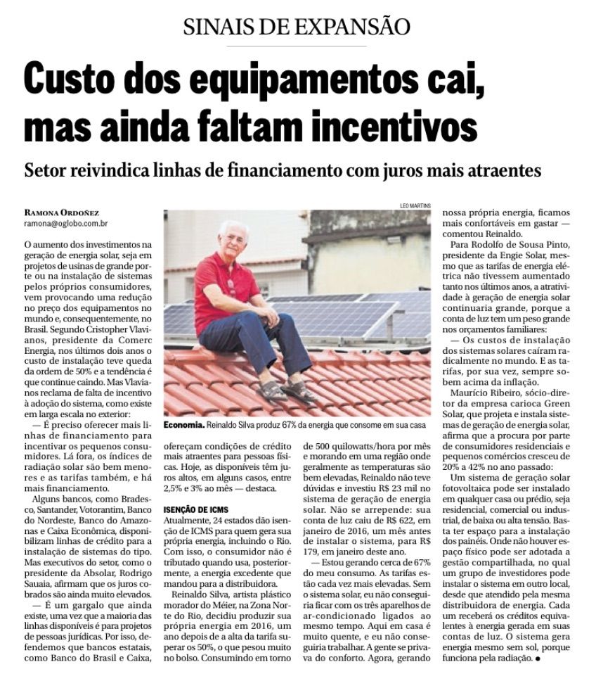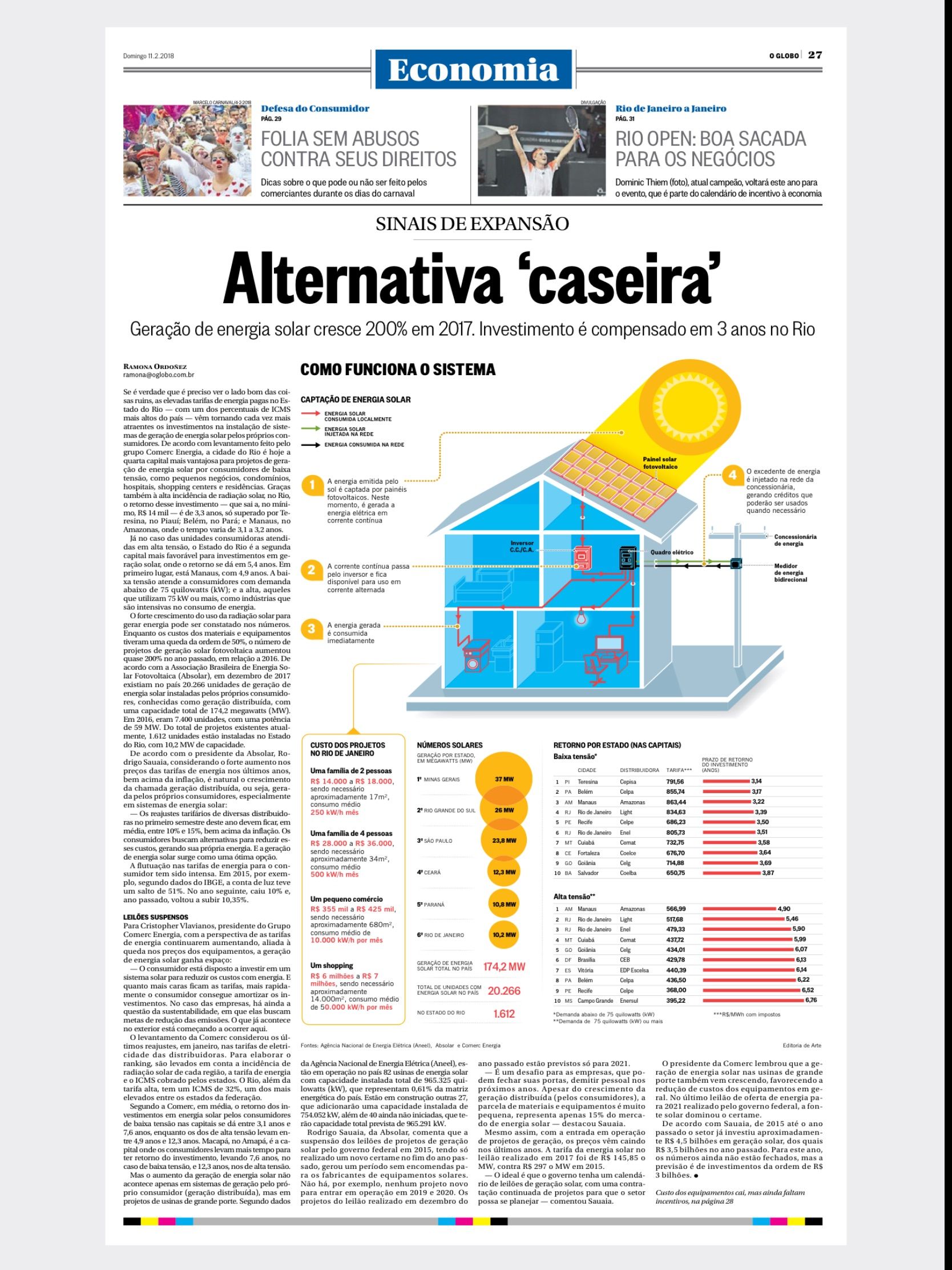 Reportagem da revista PEGN (Pequenas Empresas Grandes Negócio) em 14/02/2018.CUSTO DE INSTALAÇÃO DE EQUIPAMENTOS DE ENERGIA SOLAR CAI 50% NO PAÍS.Clique para ver reportagem completa.